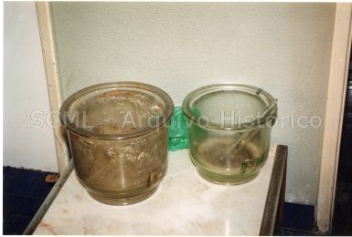 Enquadramento de dois recipientes em vidro de formato cilíndrico, ainda com vestígio de preparado.