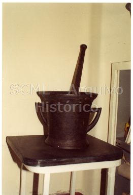Destaca-se, em primeiro plano, um almofariz com pilão, colocado sobre um banco.
