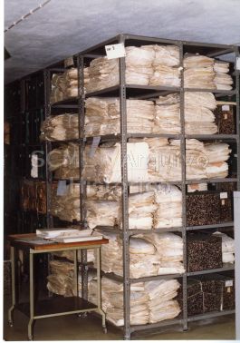 Enquadramento que pretende destacar documentação acondicionada em prateleiras.