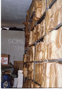 Enquadramento que pretende destacar vários maços com documentação, acondicionados em prateleiras.