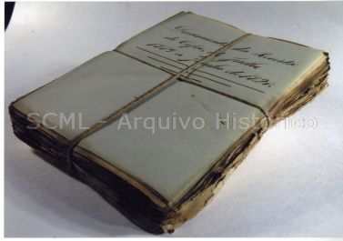 Plano de um maço de documentos de receita do Cofre da Santa Casa da Misericórdia de Lisboa, atado com um cordel.