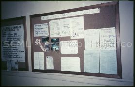 Observam-se diversas folhas de papel com textos e ilustrações sobre o estabelecimento.