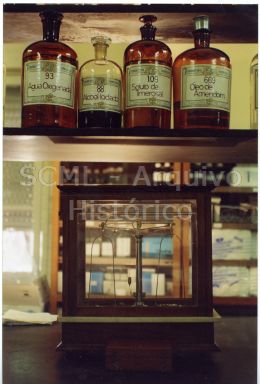 Destacam-se, em primeiro plano, vários frascos de vidro com rótulo e uma balança de precisão, acondicionados numa estante de madeira.