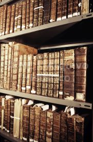 [Pormenor de uma estante com livros, nas instalações do Arquivo Histórico da Santa Casa da Misericórdia de Lisboa, sitas na Avenida D. Carlos I]
