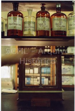 Destacam-se, em primeiro plano, vários frascos de vidro com rótulo e uma balança de precisão, acondicionados numa estante de madeira.