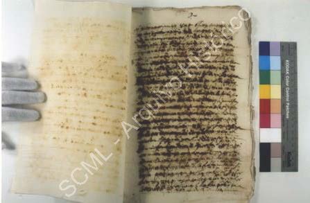 Ao longo do reverso, encontram-se as seguintes inscrições: "Escritura de venda - maço 1 / Escrituras, proc.n.º 3, fl.1 - recto / Ano de 1638 / Restauros 91/018 / Antes Rest. - 31/01/2007".