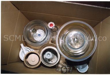Plano superior sobre uma caixa aberta, dentro da qual se encontram vários objetos de porcelana e vidro.