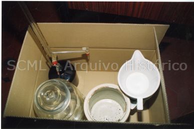 Plano superior sobre uma caixa aberta, dentro da qual se encontram vários objetos de porcelana e vidro.