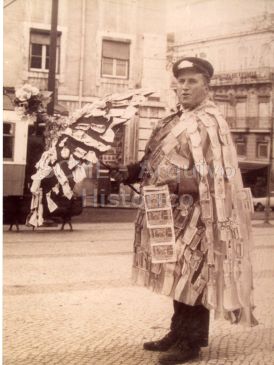 [Reprodução de um retrato de cauteleiro da Santa Casa da Misericórdia, desfilando com cautelas sobre o vestuário numa rua de Lisboa]
