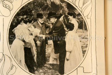 Enquadramento de parte da página n.º 472 da revista "Ilustração Portuguesa", n.º 190, publicada em 11 de Outubro de 1909, no qual se destaca um retrato das alunas do Recolhimento de São Pedro de Alcântara a conversar com dois homens.