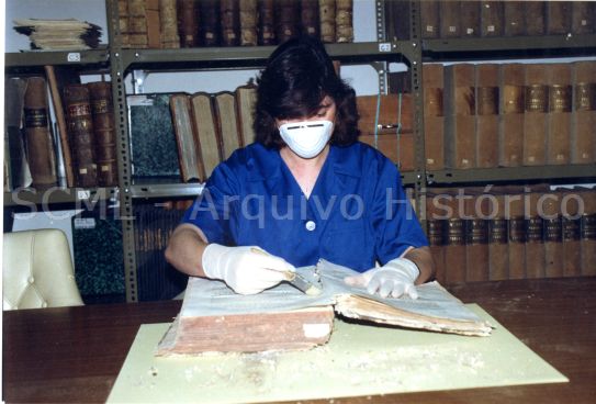 A retratada, colaboradora da Santa Casa da Misericórdia de Lisboa, encontra-se a proceder à higienização de um livro da Biblioteca do Marquês de Alegrete nas instalações do Arquivo Histórico, sitas na Avenida D. Carlos I, em Lisboa.