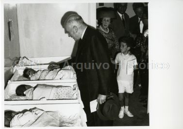 Destaca-se, em primeiro plano, Américo Deus Rodrigues Tomás, 13.º Presidente da República Portuguesa e último do Estado Novo, junto de vários bebés que se encontram deitados em berços e brincando com um deles.