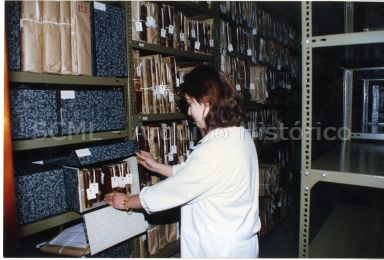 A retratada, colaboradora da Santa Casa da Misericórdia de Lisboa, encontra-se a proceder ao acondicionamento de exemplares de livro antigo numa estante, nas antigas instalações do Arquivo Histórico, sitas na Avenida D. Carlos I, em Lisboa.
