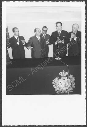 Plano de pormenor de José Guilherme Rato de Melo e Castro, provedor da Santa Casa da Misericórdia de Lisboa, a discursar (2.º a contar da esquerda), acompanhado por mais 4 indivíduos que aplaudem a sua intervenção.
