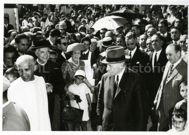 Observa-se um grupo diversificado de pessoas, ao ar livre, no centro do qual se destaca Américo Deus Rodrigues Tomás, 13.º Presidente da República Portuguesa e último do Estado Novo.
