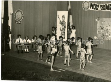 Observam-se várias crianças em palco, algumas a dançar e outras sentadas, a assistir.