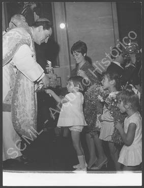 Destaca-se, em primeiro plano, um grupo de crianças oferecendo ramos de flores ao clérigo celebrante, por ocasião de um evento na Igreja de São Roque da mesma cidade.