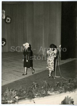 Observam-se duas mulheres em palco, a representar.