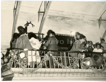 Observa-se um grupo diversificado de pessoas numa das varandas do edifício sede da Sociedade de Instrução e Beneficência "A Voz do Operário".