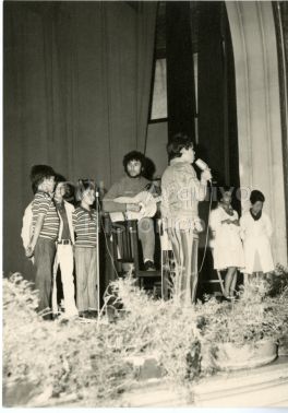 Observam-se cinco crianças em palco, a cantar.