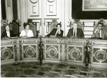 Os retratados, conferencistas em evento, encontram-se sentados, de frente para o observador.