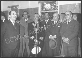 Em 1.º lugar, a contar da esquerda, identifica-se, José Guilherme Rato de Melo e Castro, provedor da Santa Casa da Misericórdia de Lisboa, discursando para os microfones da Emissora Nacional.