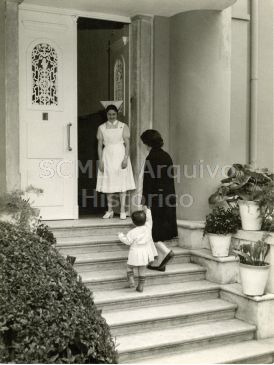Observa-se uma educadora, de frente para o observador, no alpendre das escadas de acesso à entrada da creche, aguardando por uma mulher que conduz uma criança pela mão.