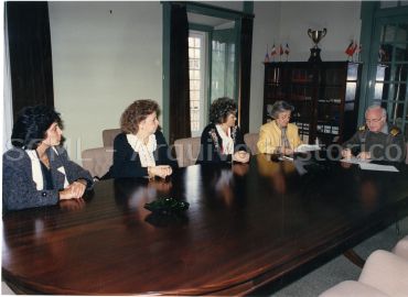 Destaca-se, um coronel do Exército, sentado junto a uma mesa de trabalho, a ler um documento, acompanhado de quatro mulheres, também sentadas.