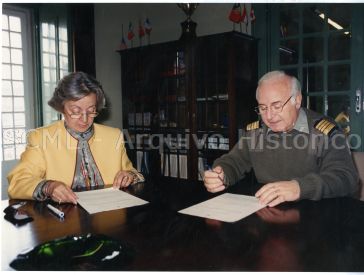 Os retratados, Maria de Lurdes Calvão Borges, diretora dos Serviços Médicos da Santa Casa da Misericórdia de Lisboa e um coronel do Exército, representante da Escola do Serviço de Saúde Militar, encontram-se a ler o documento, sentados, junto a uma mesa de trabalho.