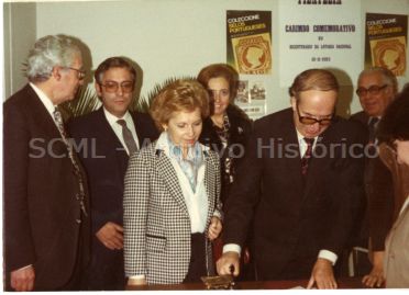 Identificam-se, a contar da esquerda para a direita, António Augusto Simões Branquinho Amaral Pereira (1.º), diretor da Lotaria, Manuel Inácio Antunes Pinto (2.º), adjunto da Mesa, Maria Adelaide Gonçalves Pires Lisboa (3.º), Adelina Odete Fernandes Marques (4.º), diretora do Serviço de Ação Social, João Joaquim Gomes (5.º), provedor da Santa Casa, e Ricardo Jorge Correia da Fonseca (6.º), diretor do Departamento das Apostas Mútuas Desportivas.