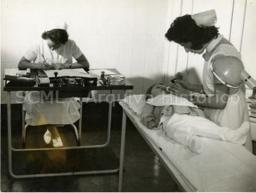 Observa-se uma enfermeira sentada, de frente para o observador, a escrever sobre uma mesa de trabalho, e uma outra enfermeira, de pé, curvada sobre uma maca, colocando gotas nos olhos de uma criança.