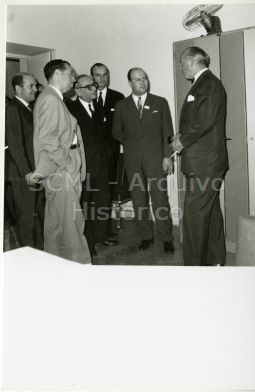 Identificam-se, a contar da esquerda para a direita, José Guilherme Rato de Melo e Castro (1.º), provedor da Santa Casa, Henrique Martins de Carvalho (2.º), ministro da Saúde e Assistência e João José Gonçalves Proença (5.º), ministro das Corporações e Previdência Social.