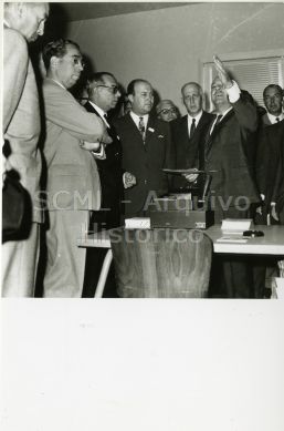 Destaca-se José Guilherme Rato de Melo e Castro, provedor da Santa Casa, a discursar para o grupo.