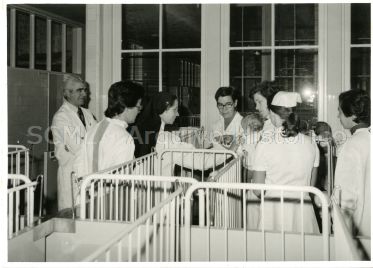 Observa-se um grupo de pessoal de saúde, rodeado de berços, brincando com um bebé que se encontra ao colo de uma das enfermeiras.