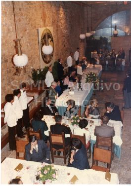 Plano superior sobre a sala ogival do Castelo de São Jorge, onde se encontram vários homens e mulheres a confraternizar.