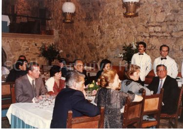 Os retratados, vários homens e mulheres, encontram-se sentados à mesa, a confraternizar.