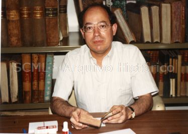 O retratado, especialista em catalogação de Livro Antigo, encontra-se sentado, folheando um livro, na Sala da leitura das instalações do Arquivo Histórico, sitas na Av. D. Carlos I, em Lisboa.
