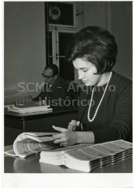 Observa-se uma mulher, sentada, conferindo um livro de bilhetes de Lotaria sobre a sua mesa de trabalho.