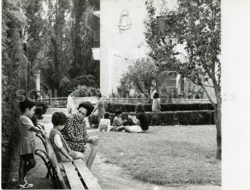 Observam-se duas mulheres e várias crianças no jardim da instituição.