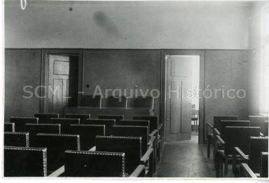 Plano de um conjunto de cadeirões alinhados e de uma parede na qual se destacam duas portas de madeira entreabertas.