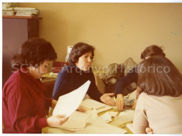 Observam-se quatro colaboradoras, sentadas junto a uma mesa de trabalho, no âmbito de uma ação de formação subordinada ao tema "Meios áudio-visuais simples".