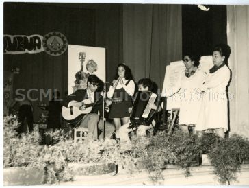 Observam-se três crianças em palco, a cantar e a tocar diversos instrumentos.
