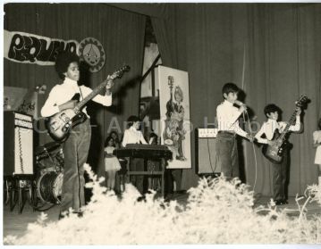 Observam-se várias crianças em palco, a cantar e a tocar diversos instrumentos.