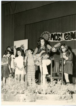 Observam-se várias criança em palco, a cantar e a tocar viola.