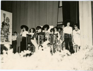 Observam-se várias crianças em palco, a cantar e a tocar acordeão.