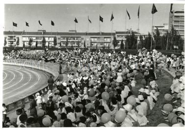 Observam-se vários grupos de crianças nas bancadas do estádio a assistir ao evento.