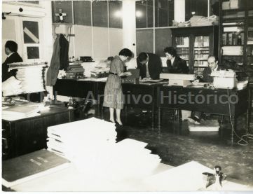 Observam-se cinco colaboradores da Lotaria da Santa Casa, numa sala de trabalho.