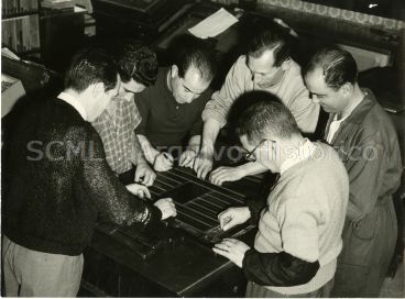 Os retratados, seis funcionários do Departamento de Jogos da Santa Casa da Misericórdia de Lisboa, encontram-se junto a uma mesa de trabalho identificando peças com caracteres de impressão.