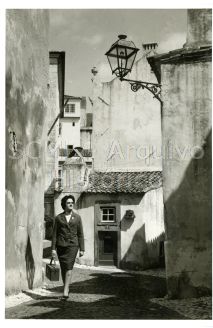 Observa-se uma mulher a andar numa rua estreita da zona histórica da cidade de Lisboa.