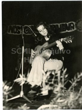 Observa-se uma mulher em palco, sentada, a tocar viola.